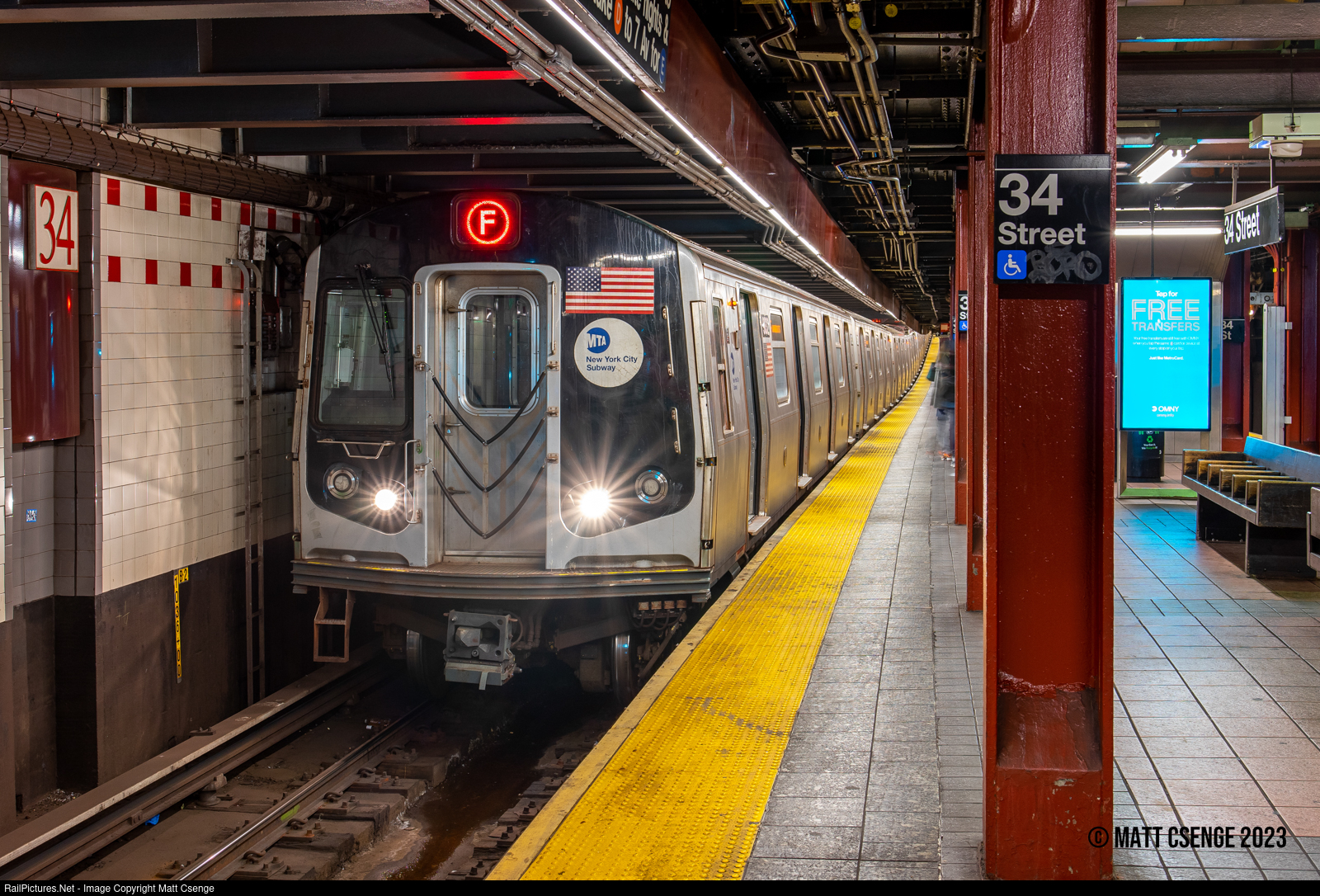 New York City Transit Authority (NYCTA) R160B no. 9832 (Kawasaki, 2005-2010) is the lead motor on an uptown F train, seen stopped at 34th St-Herald Square Station on the IND 6th Avenue Line.
