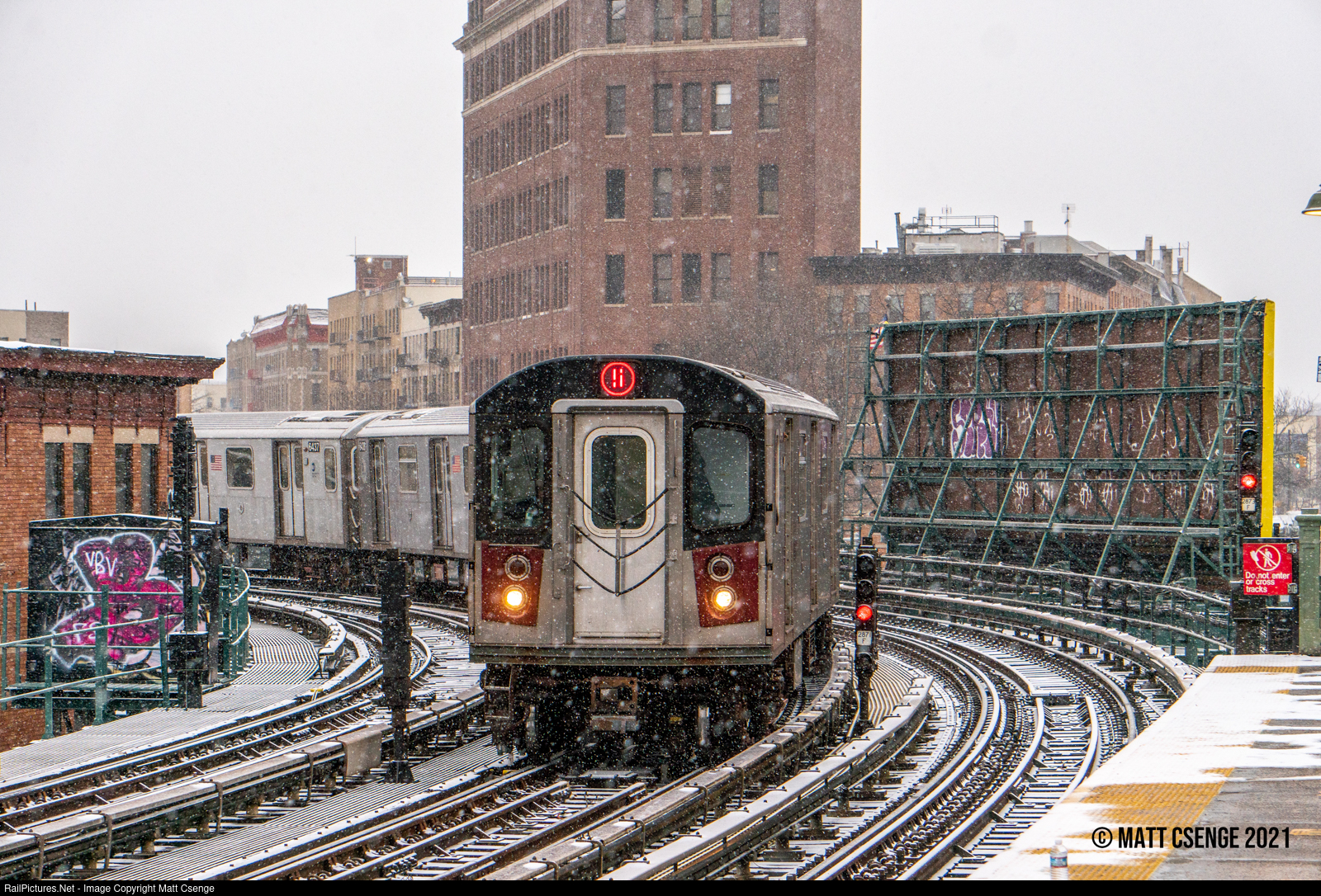 An inbound 5 express train of R142 cars (Bombardier, 1999-2003) rounds the curve north of Simpson St Station on a snowy morning along the IRT White Plains Road Line.