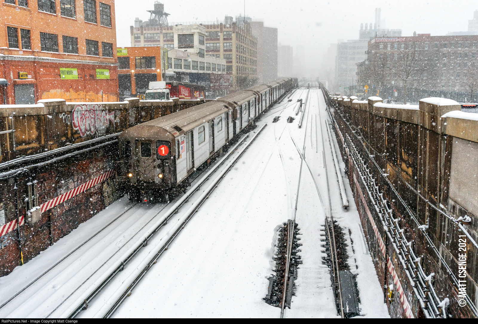 New York City Transit Authority (NYCTA) R62A no. 2311 (Bombardier, 1984-1987) is the lead motor on an uptown 1 train seen diving down into the Broadway-7th Avenue Line portal at 135 St, where the switch heaters are hard at work melting the continuously falling snow. |