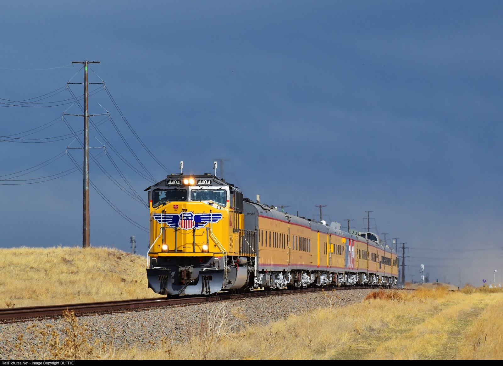 | Late evening storm light catches UP 4404 (SD70M) as it brings a heritage car passenger train towards Denver, Colorado.