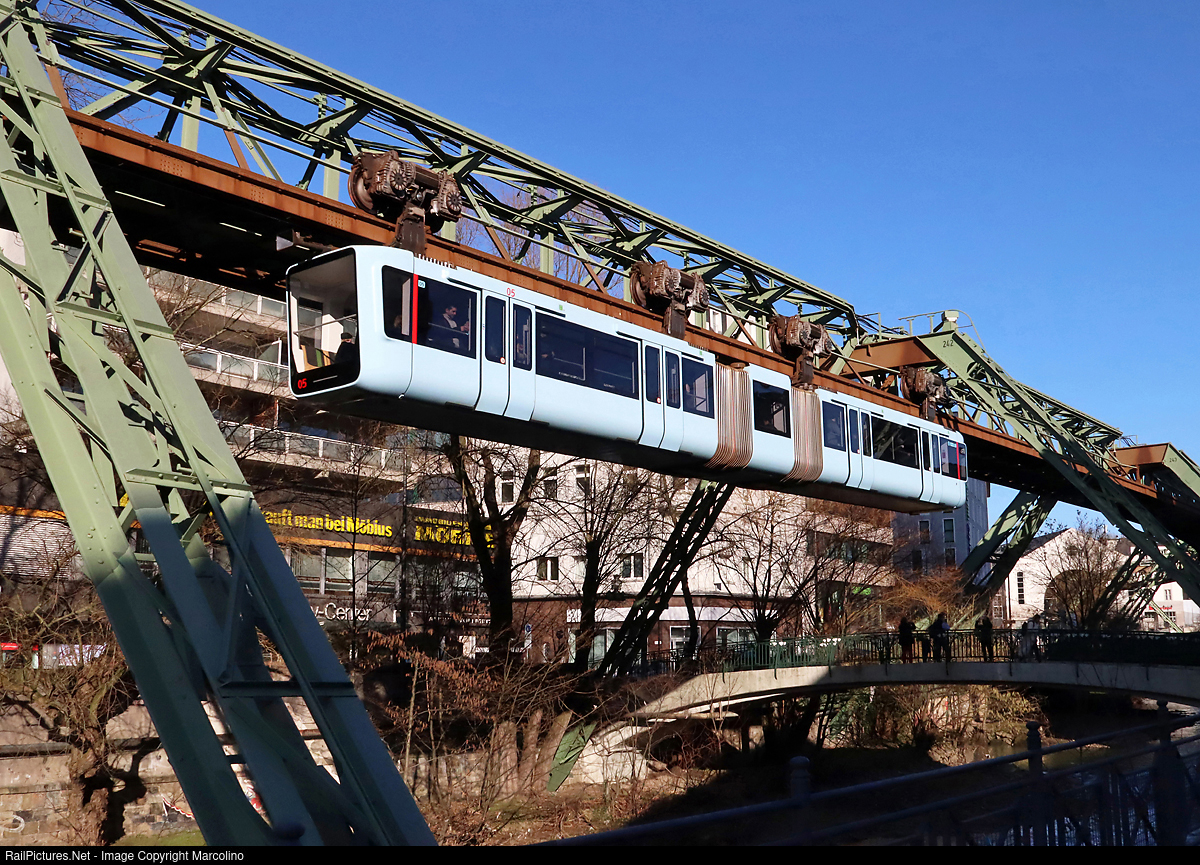 Train from the 'Suspension-railway' between the stations 'Ohligsmuehle' and 'Hauptbahnhof' (Main Station). There is only one line with 20 stations, 13.3 km long from Wuppertal Vohwinkel to Oberbarmen, max speed 60 km/h. The cabin is hanging at the track. The trains run mostly above the river 'Wupper'. Since the renovation a few years ago this is the original color.