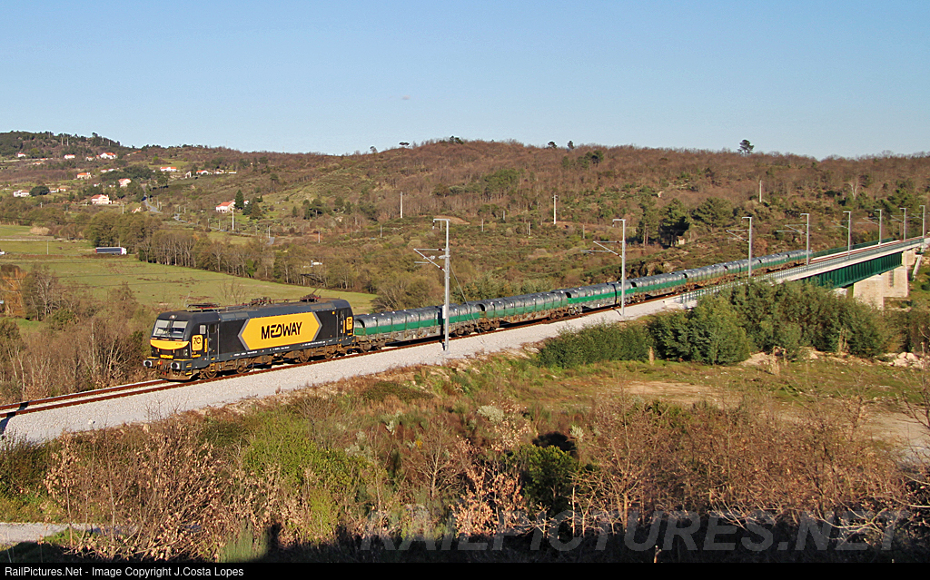 | At sunset a Medway freight train, 98208, from Vilar Formoso to Alfarelos, has just passed the Corge river bridge.