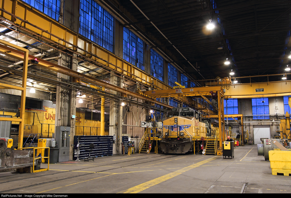 As the blue hour settles over Denver, Colorado, on December 7, 2015, Union Pacific GE AC4400CW-CTE No. 5687 sits inside the cavernous main hall of the former Rio Grande backshop at Burnham Shops. No. 5687 is getting an overhaul and a change out of its old 4,400 hp 7FDL16 prime mover. In a place that once built and rebuilt steam locomotives, this unit is the last locomotive to be overhauled at Burnham before UP closed up the place on February 14, 2016. On the left, UP EMD SD70M No. 4524 is getting PTC installed.