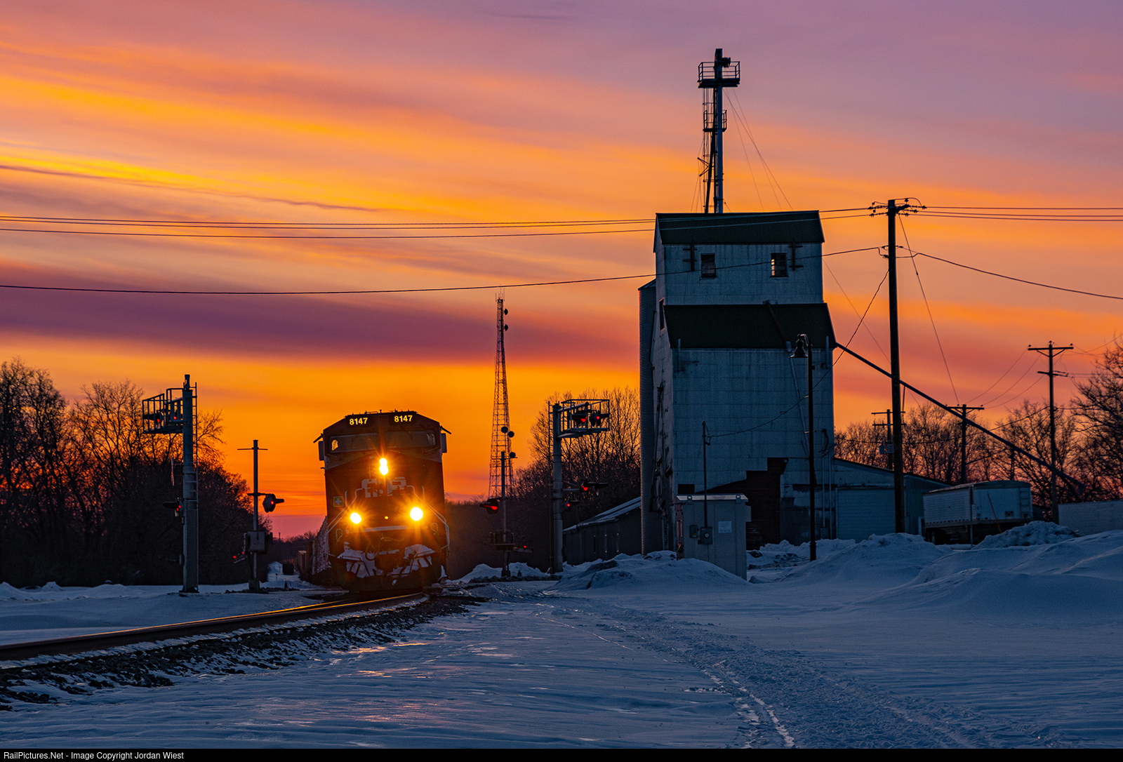 Late in the evening, train 148 flies east through the small town of Kimball as a spectacular sunset ensues.