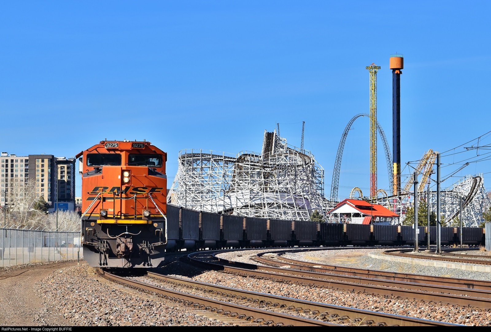 BNSF 9285 (SD70ACe) shoves an empty coal train through downtown Denver, Colorado and past the roller coasters of the Elitch Gardens amusement park.