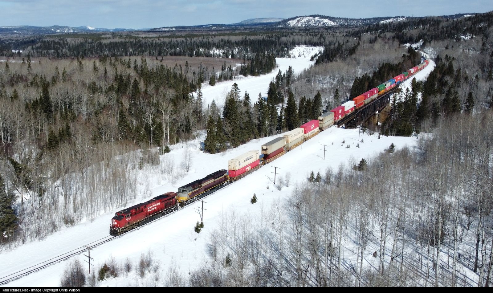CP ES44AC 8920 + CP SD70ACU 7017 pull the hot shot Toronto - Vancouver intermodal across a frozen Pic River.