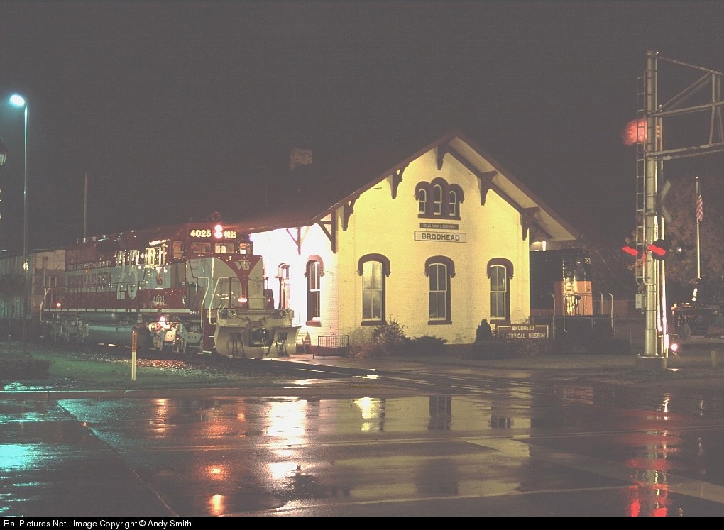 | Released from the paint shop a few days earlier, WSOR's 25th anniversary unit poses in front of the Brodhead depot in a driving rain. |