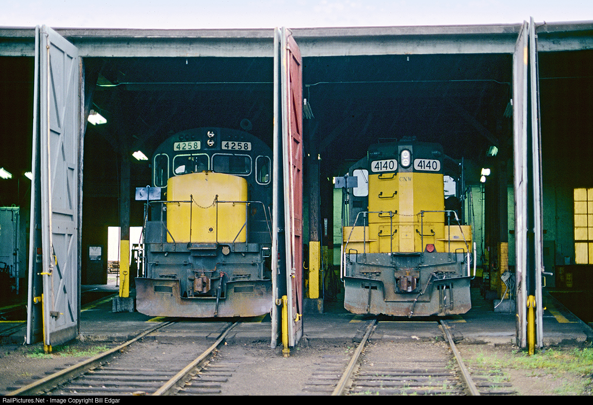| CNW Also C-425 no. 4258 shares space in North Green Bay's roundhouse with CNW Geep no. 4140. By 1986 Green Bay had replaced the "Alco Line" as the center of Alco locomotives on the railroad. The roundhouse had been known for its FM locomotives from the 50s to early 70s, and the fleet of former N&W C-628s moved in to take over with FM retirements. By 1986 the Alco Line had been spun off, so some remaining 4 axle Alcos were reassigned to Green Bay. |
