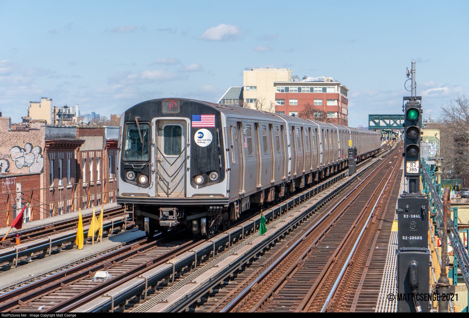 A Coney Island-bound (F) train led by R160A no. 9243 (Alstom, 2005-2010) passes a trio of colored flags at Avenue U station on the Culver Line. The three colors give different indications to train operators regarding the work zone south of here: