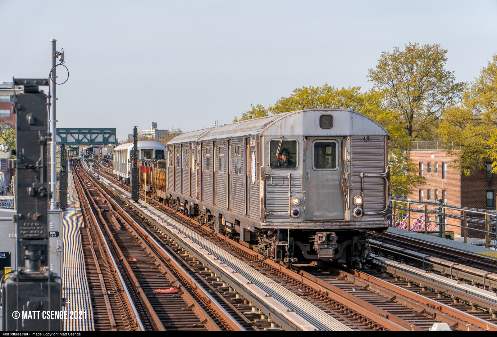 New York City Transit Authority (NYCTA) R32 no. 3694 (Budd, 1964-1965) is the lead motor on a southbound garbage train seen approaching Avenue U station on the Culver Line en route back to Coney Island Yard. |