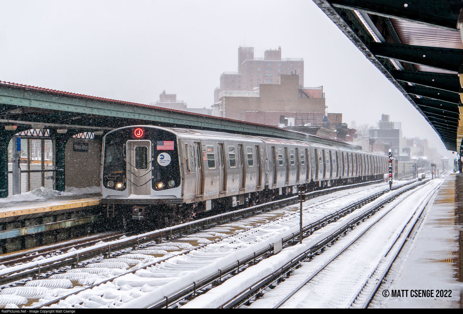 New York City Transit Authority (NYCTA) R179 no. 3145 (Bombardier, 2016-2019) is the lead motor on a Queens-bound J train seen arriving at Hewes St Station on the Jamaica Line.