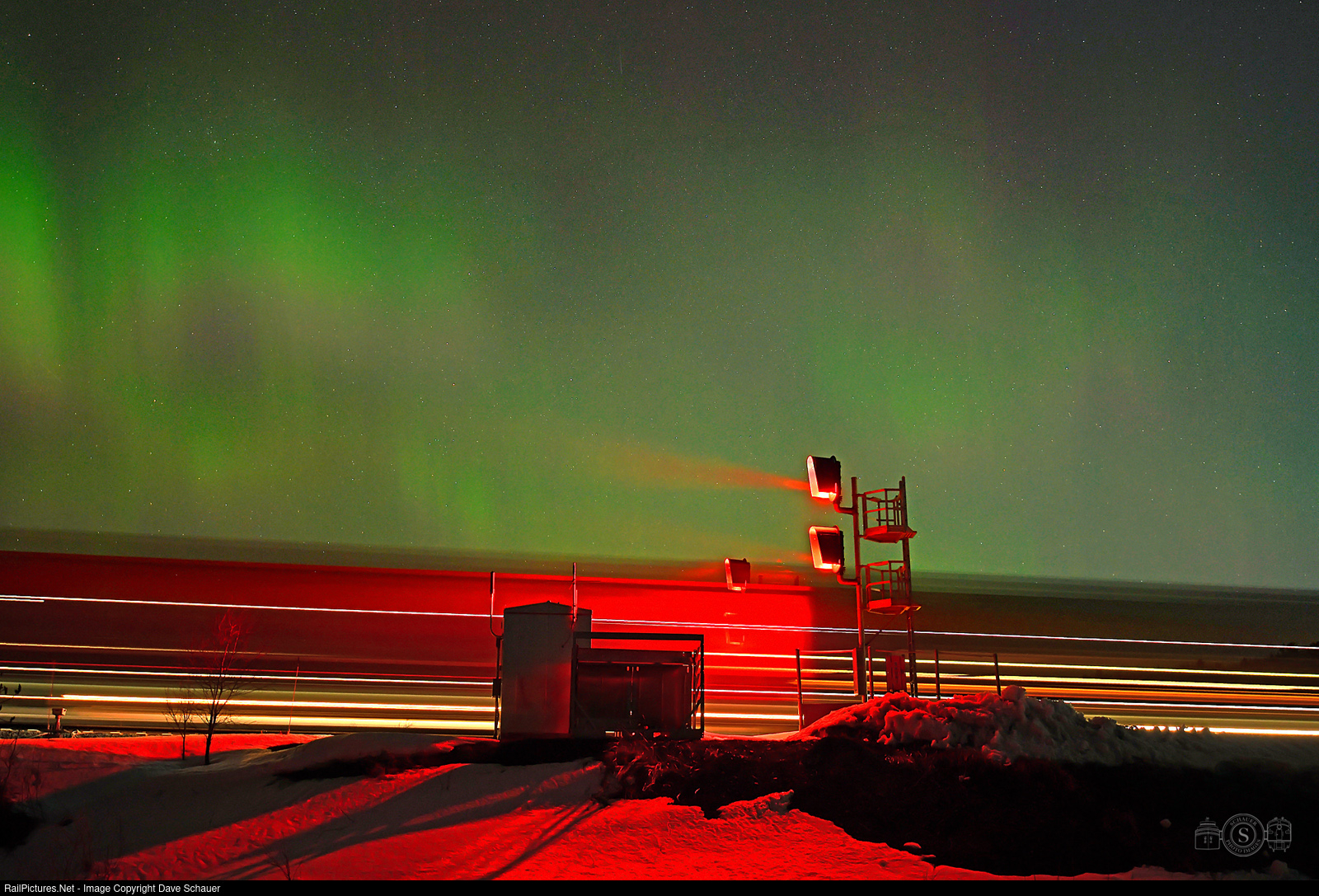 A loaded all-rail ore train eases down Steelton Hill in western Duluth as northern lights put on a show above.