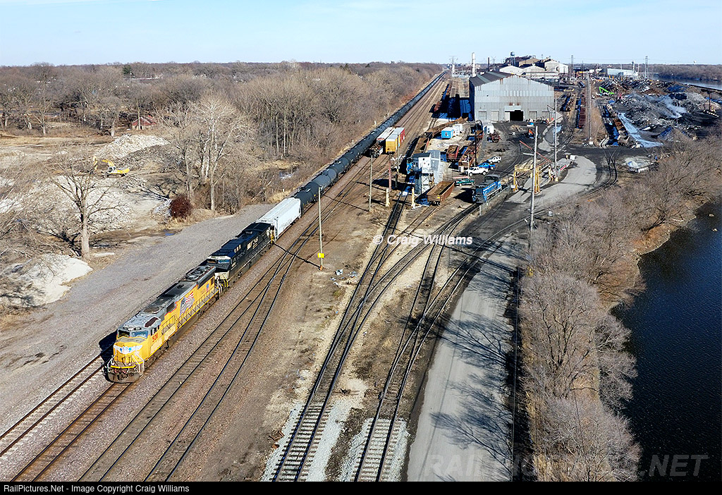An empty ethanol train passes the spacious Sterling Steel Plant along the Rock River. The train is working west towards the next crew change point at Clinton, IA, on the UP Geneva Sub.