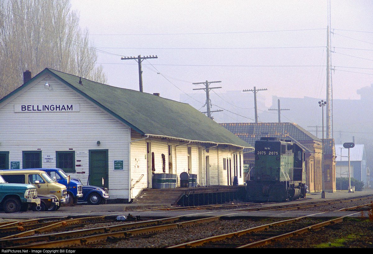 Before a Fairhaven transportation center was built south of downtown, Bellingham relied on these two former Great Northern structures for accessing GN, BN and later Amtrak passenger service. BN and Amtrak were still using both of these structures in early 1985. BN local and switching crews would start their days here and handle chores in the nearby yard as well as generate some locals. BN 2075, part of an SP&S order for GP38s, and among the first locos delivered to BN in green, waits for a crew to start switching chores for the day. 15 years old, it is still holding up quite well.