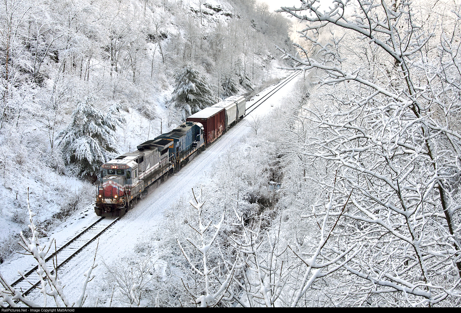 On the morning after an overnight blizzard, Ohio Central four-axle GE pair 8530 and 3185 bring a three-car local train east through the large cut west of Bowerston, Ohio, on March 10, 2017. A tunnel out of frame to the left was negated by the creation of this cut several decades ago as the PRR looked to make improvements to their Panhandle route between Pittsburgh and Chicago.