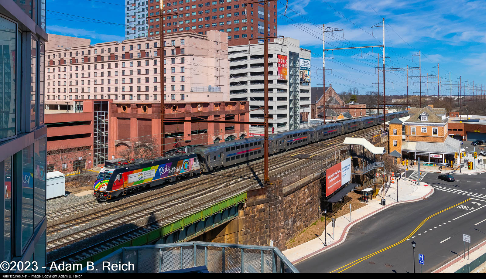 NJ Transit's Pride Unit departs New Brunswick station with a Trenton-bound Northeast Corridor Line train on Saturday, March 18, 2023.