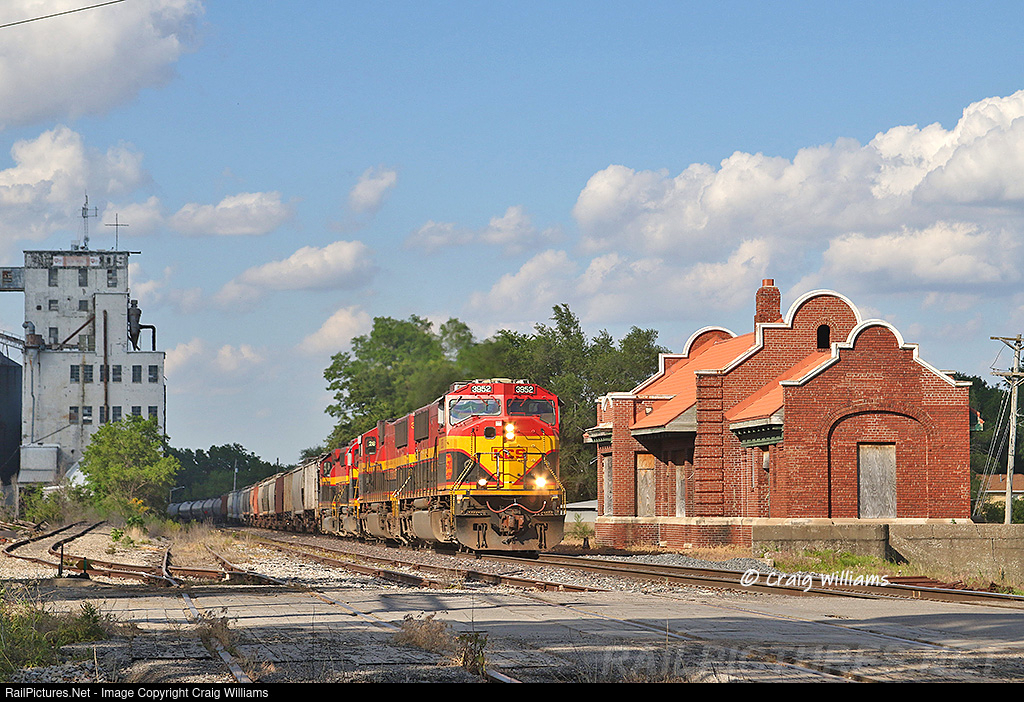 | The old Gateway Western trackage thru Missouri has alot of neat stuff to shoot. The problem is the train traffic is light and normally nocturnal for the most part. On Wednesday, 6/02, many problems caused an outbound MVNKC train to be over 12 hours late leaving East St. Louis. That created a rare daylight train west of Mexico on Thursday. I was super glad to grab this shot at Marshall on the KCS Mexico Sub. This neat 1906 built Chicago and Alton Railroad depot was a shot I figured I would never get. |