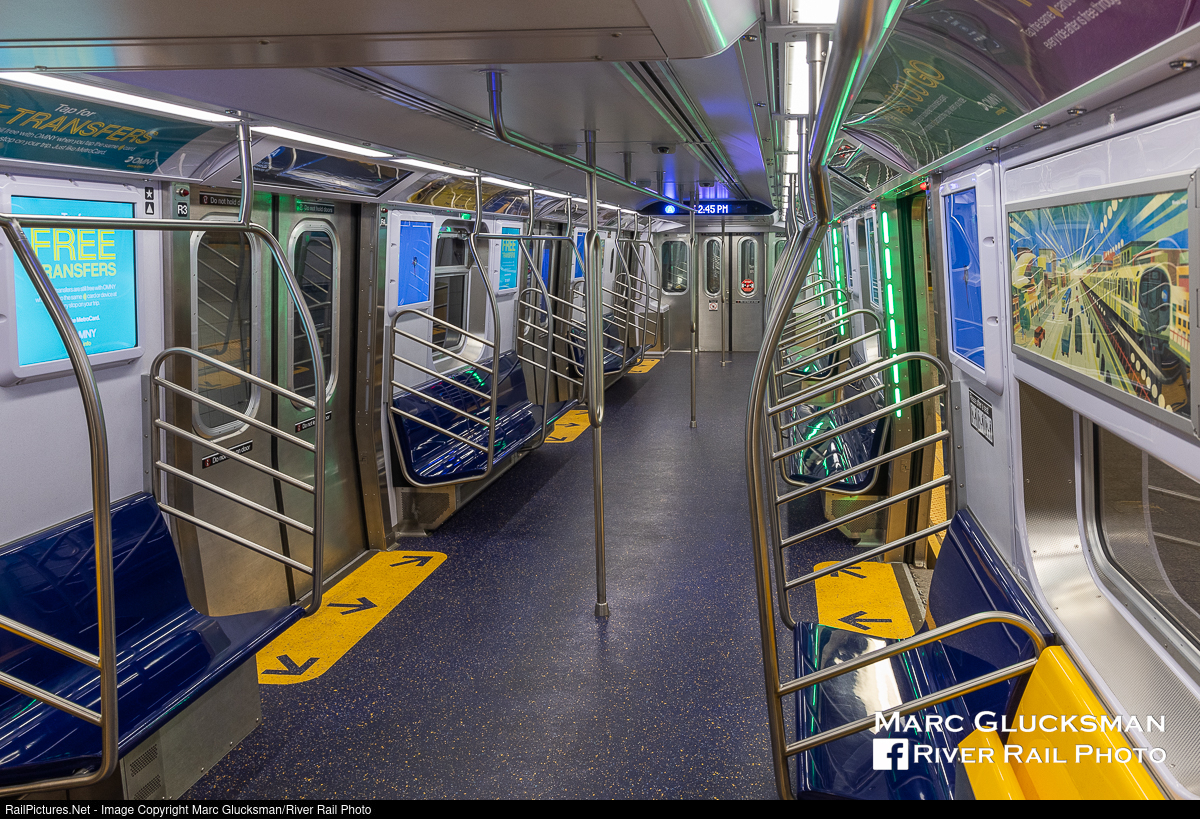 Bright On The Inside. On the afternoon of March 25, 2023, a view of the interior of Metropolitan Transportation Authority - MTA NYCT Subway Kawasaki built R-211A 4065 shows many changes from previous classes. Bright blue seats are fixed in place while yellow seats fold up for ADA accommodation. Bright digital screens display advertising, allowing for easy changes, and the interior itself is very bright. Not visible from this perspective, digital strip maps are above every door to display upcoming stops.