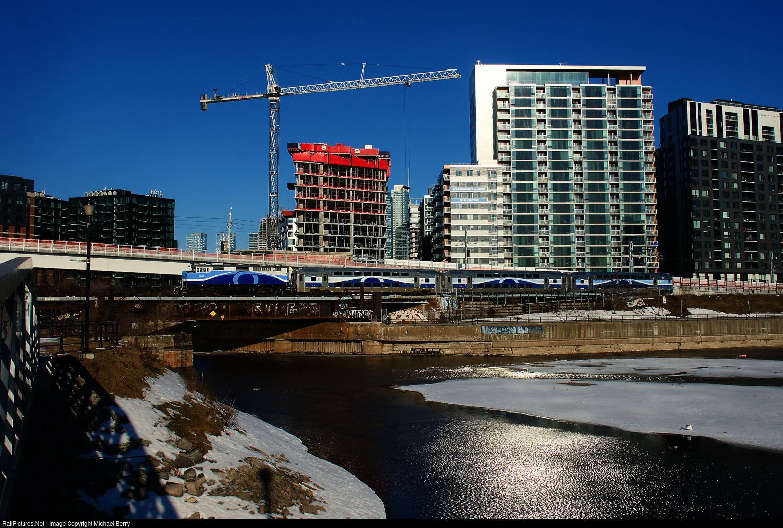 The second of three trains that goes to Central Station from Mascouche on weekday mornings passes the Peel Basin.