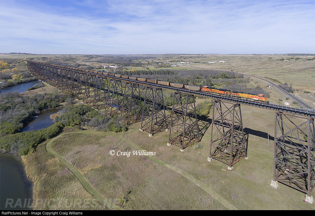 | A pair of DP units shoves on the back of this Superior to Deck Mine empty coal train on the Jamestown Sub. The train is crossing the massive bridge over the Sheyenne River at Valley City. The bridge is 3,860 feet long and 162 feet above the river. Construction work began on July 5, 1906 and it was completed on May 8, 1908. The CP Carrington Sub crosses under the bridge on the east end. |