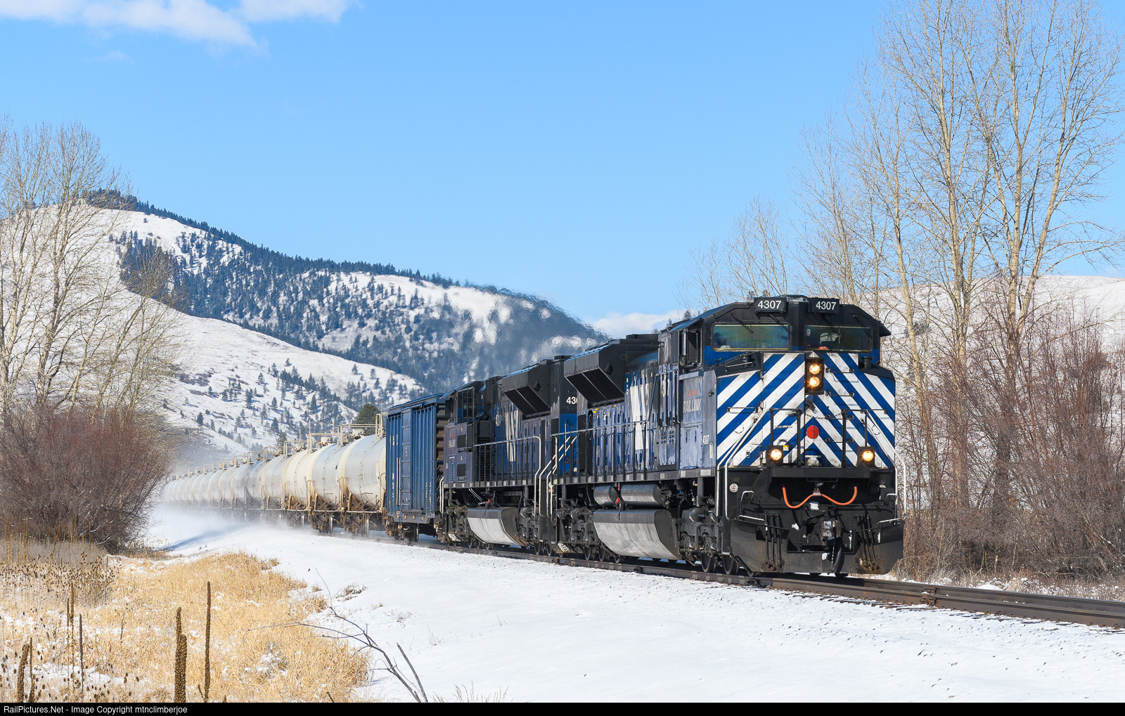 | A pair of Montana Rail Link SD70ACe's lay the hammer down as they approach Arlee, Montana with the MRL Day Gas job in tow. The train of tank cars kick up the fresh snow from the night before as the crew wastes no time heading towards Missoula. |