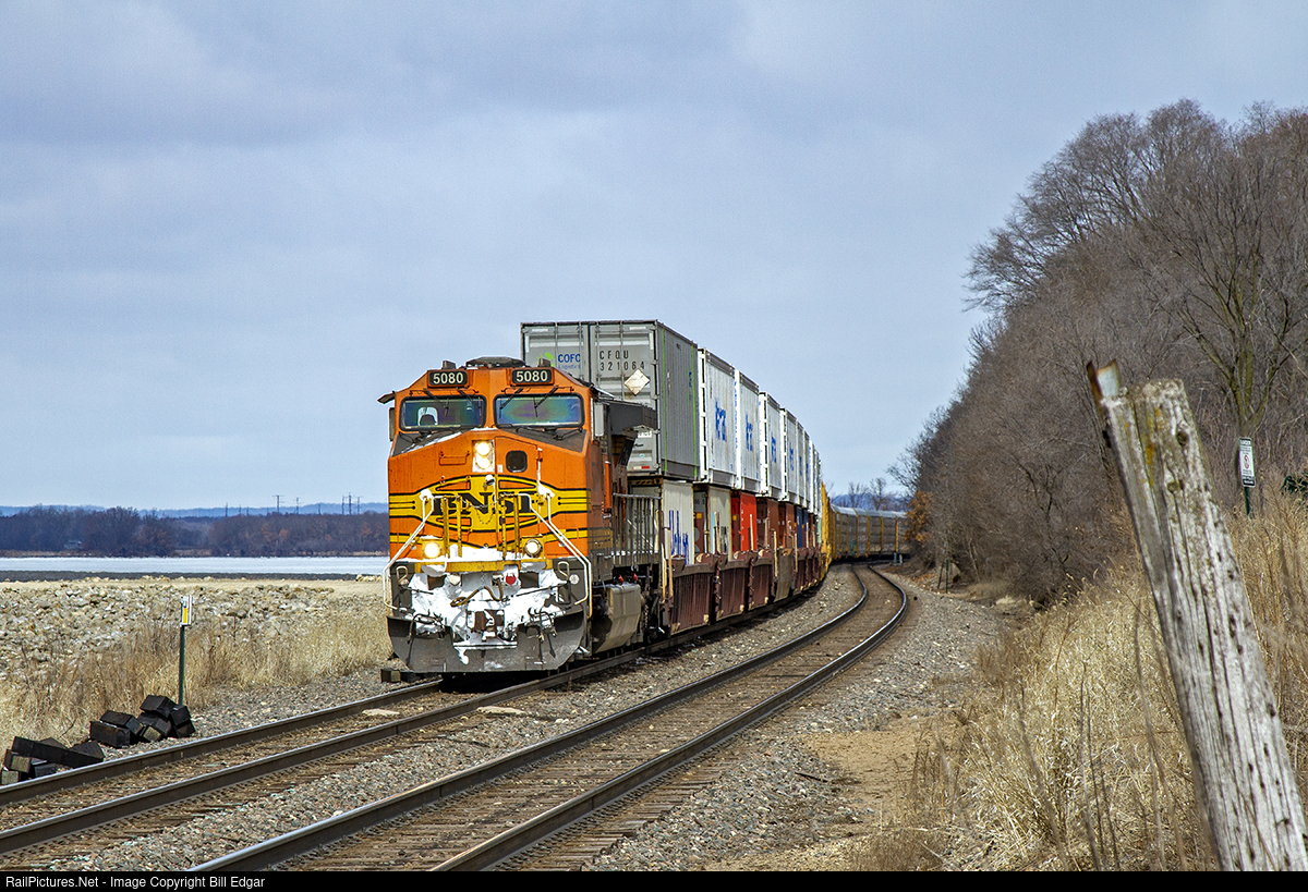 BNSF 5080 holds a stack/vehicle train along Lake Onalaska at Onalaska, WI. The lake is formed by the confluence of the Black River with the Mississippi River just north of La Crosse, WI. The crew is waiting to end their run from the Twin Cities to North La Crosse, and about a half hour after this photo was taken, the yard cleared a spot and this train proceeded in for the crew change. Meantime, three more eastbound trains were stopped and stored between Winona Jct. and Nelson, WI, essentially making BNSF a single track railroad this day.