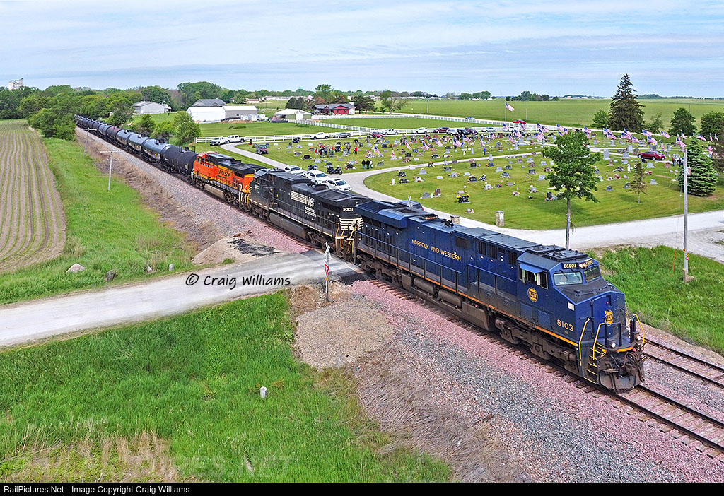 | Memorial Day has the N&W heritage unit leading the daily Waterloo to Kirk Yard freight out of Iowa. Here it passes the Jesup Cemetery as people gather to pay their respects in a flag filled cemetery. |