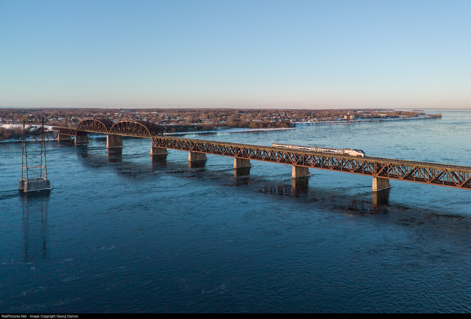 | Not long after sunrise, F59PHI no. 1322 is returning a deadheading consist of three Bombardier Multilevel cars to the end of the line at Candiac, to make another commuter turn as EXO train no. 76 into Montreal, and would cross back over the Saint-Lawrence in a little less than an hour. |
