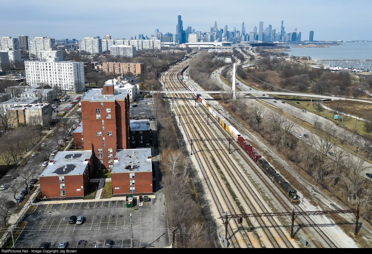 Seen high above Bronzeville in Chicago, CNs L536 transfer crawls out of the city with two Illinois Central paint SD70s for power.