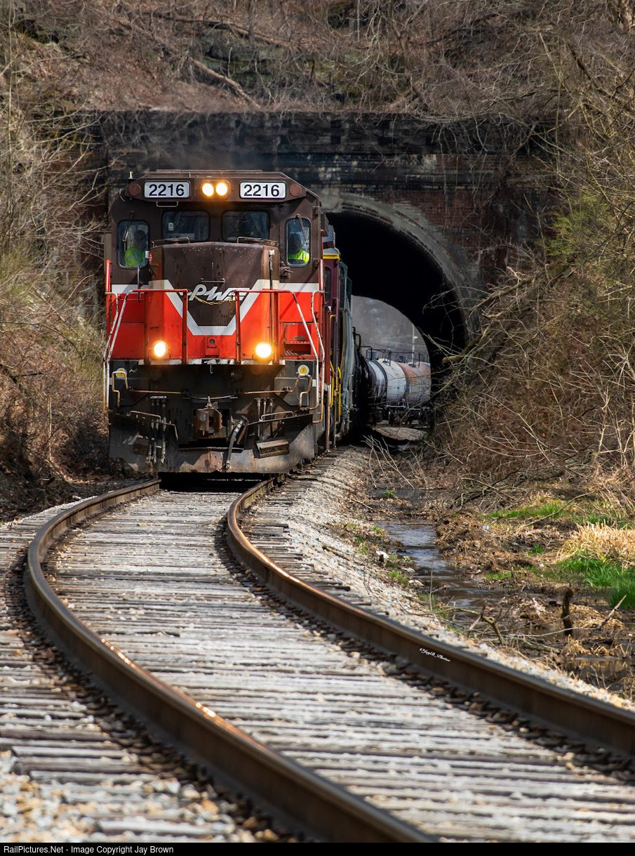 | One of the many engines newly slated for inevitable scrap by G&W, Ohio Centrals Zanesville Local emerges from the west tunnel portal in Cambridge with two of OHCRs finest “Super 7” dash 7 locomotives. One painted in Providence and Worcester colors, and the other in Ohio Centrals’. |