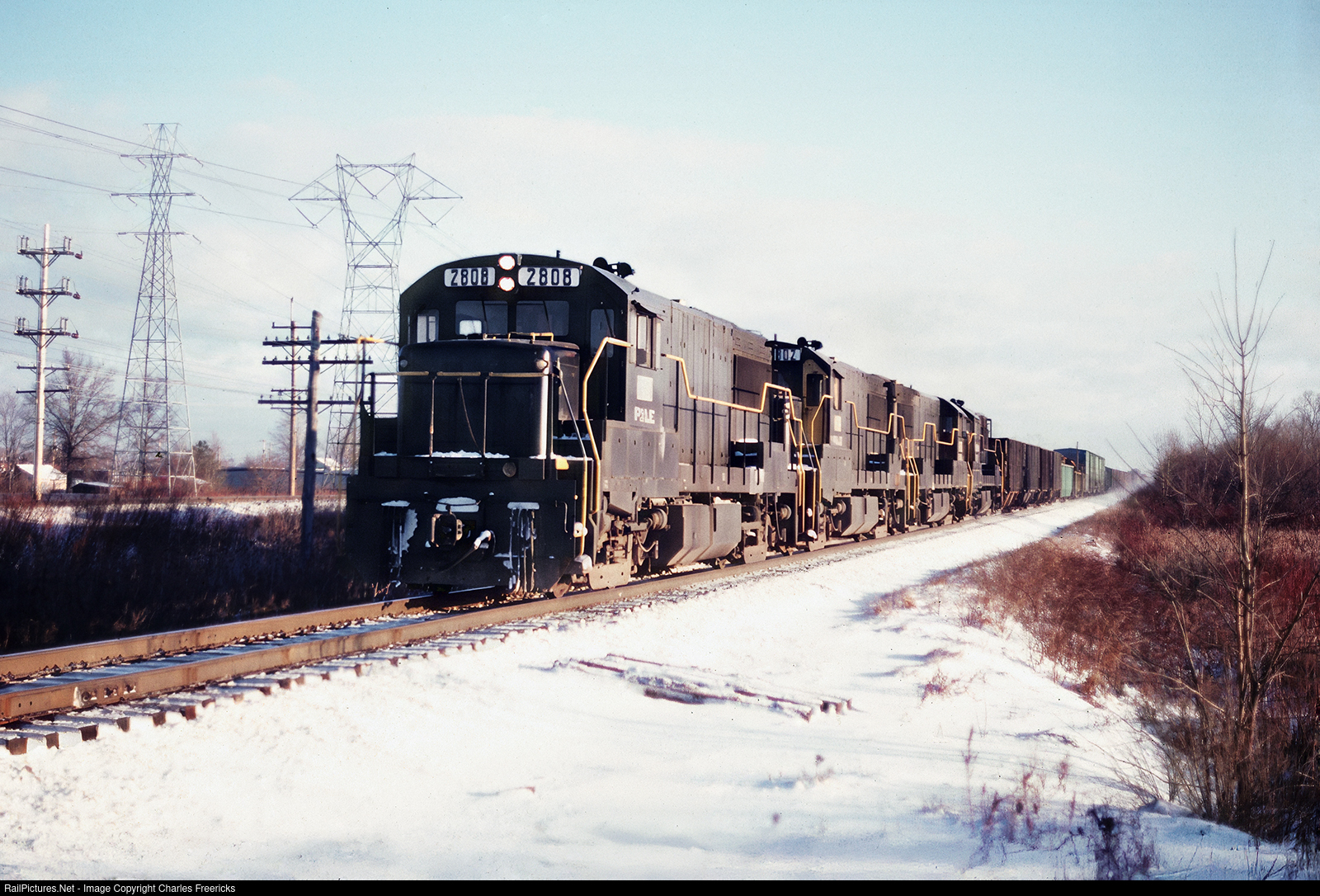 Despite having tried to railfan the Pittsburgh & Lake Erie main once, this U28B quartet lead overhead is the only Pittsburgh & Lake Erie train I ever saw in my lifetime and it was on the Norfolk & Western in Mentor, Ohio. A friend and I had his dad's car and were railfanning while his dad was taking meetings on a business trip. We planted ourselves at what I now believe was the Plaza Road grade crossing, where we could run from the Conrail line to the Norfolk & Western line, and not miss a thing. Gateway (Youngstown) to Bellevue train during that time frame, this was an overhead rights move on Norfolk & Western that used the Youngstown Line to Ashtabula, on former Penn Central trackage rights that Conrail was then fighting, and then took the former Nickel Plate west. These trains often had N&W power as well as P&LE. Mentor OH, 12/28/78, Charles Freericks Photo