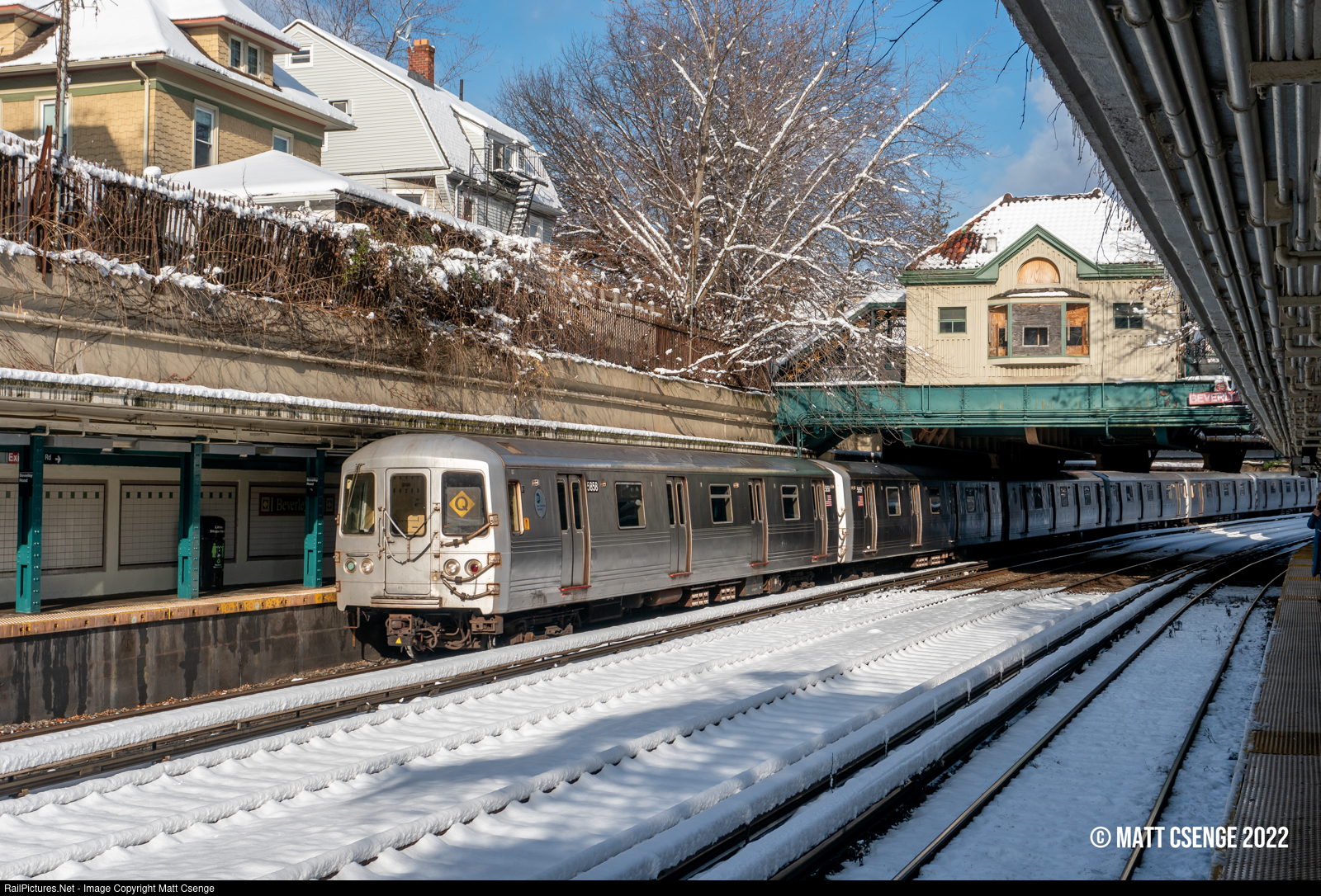 A Coney Island-bound Q train is arriving at Beverley Rd Station on the Brighton Line, after the first snowstorm of 2022 blanketed Brooklyn with fresh powder. The train is made up of R46 cars manufactured by Pullman-Standard from 1975-1978, with car no. 5858 leading. |