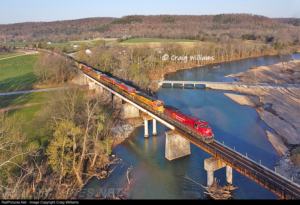 | A BNSF coal empty out of Texas is bound back to the BNSF in KC. Somehow this thing has everything for power. The rear 2 units are more than likely KCS helper units from a southbound loaded train out of Pittsburg that this empty picked out to return to Pittsburg. To find a CP unit on this empty I found odd, and it would setout at Pittsburg to be used on a KCSH later in the day as a DP unit. Here the train greets the early morning light as it passes over the Elk River at Ginger Blue. |