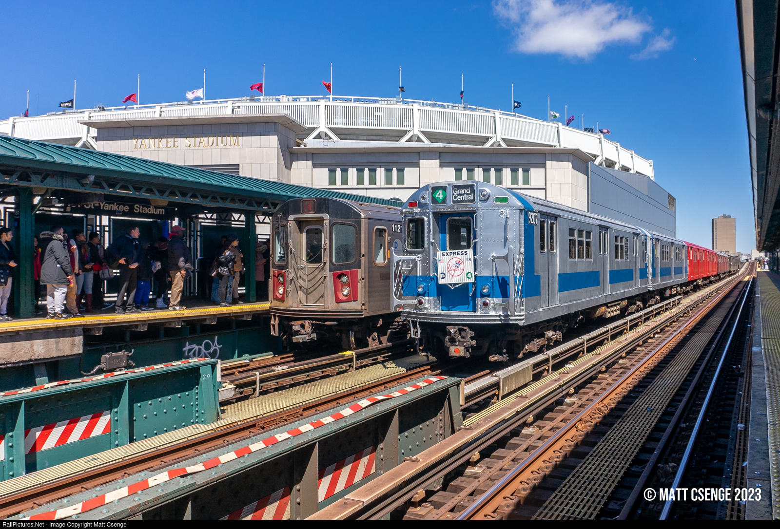 Yankee Special. New York City Transit Authority (NYCTA) R33 no. 9207 (St. Louis Car Co., 1962-1963) is seen laid up with its train on the middle track at 161st St-Yankee Stadium Station on the IRT Jerome Avenue Line, while R142 no. 1121 (Bombardier, 1999-2003) arrives with a Manhattan-bound 4 train. The R33 "SMEE" train operated a NY Transit Museum special for the Yankees home opener, along with a 4-car train of Lo-V cars seen far in the background.