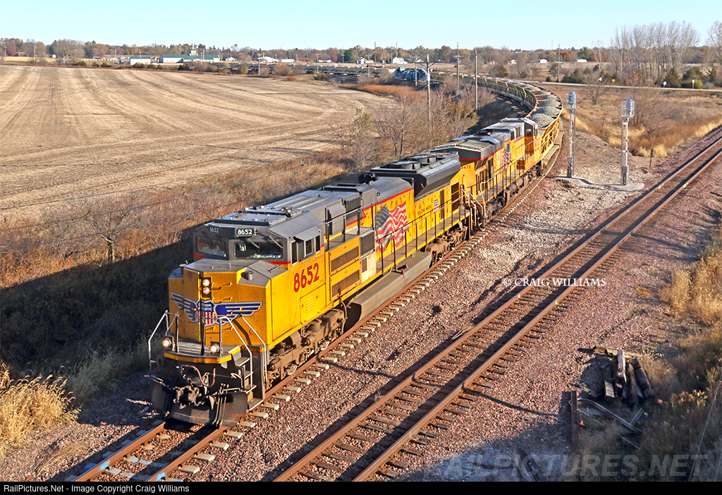A slot rock train swings around the corner at Chicago Jct onto the Spineline. The train came off the Clinton Sub eastbound and is now southbound on the Mason City Sub towards Des Moines. The train came out of Cheyenne, WY, and is bound for Mill Grove, MO.