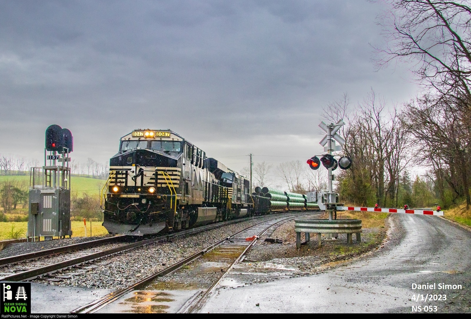 On this first of April, a pipe train runs through Broad Run, Virginia during the rains heading east on the NS B-Line.