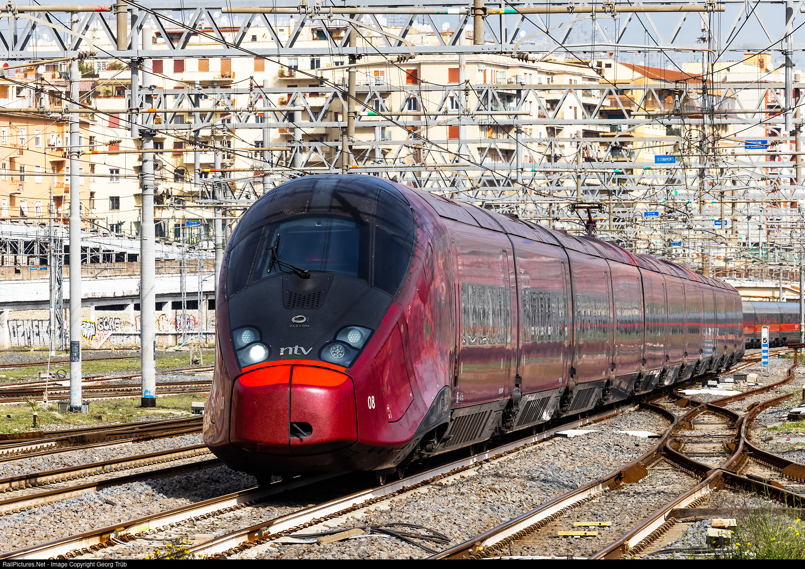 | Highspeed train ETR 575 # 008 of the NTV (Nuovo Trasporto Viaggiatori) is running through Roma Tiburtina station as train "Italo 9971" from Torino Porta Nuova via Milano-Roma Termini-Napoli to Salerno (nonstop from Milano Rogoredo to Roma Termini). This highspeed trains for 300 km/h were built by Alstom in a series of 25 from 2010 for the italian NTV (Italotreno), designated as "AGV" for "Automotrice à grande vitesse" in french and is a further development of the french TGV. |