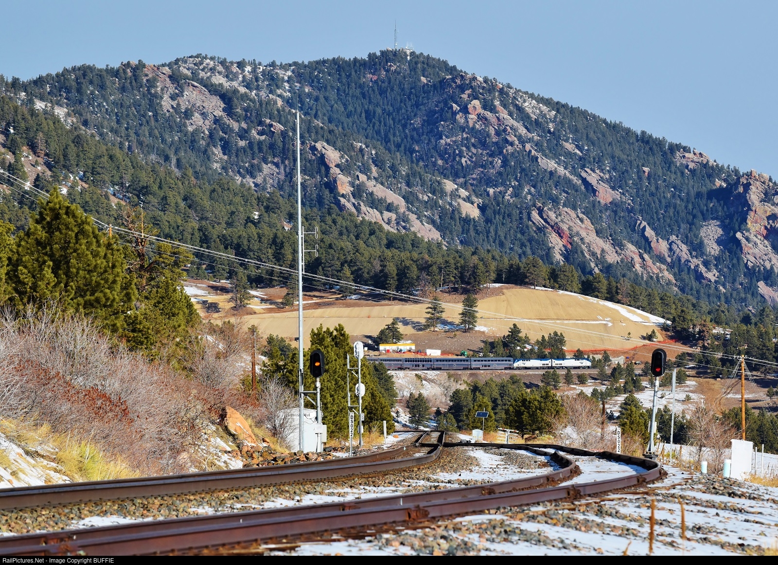 The Amtrak Winter Park Express Ski Train runs through Plainview, Colorado as seen from the top of the Eisele Siding at Blue Mountain.