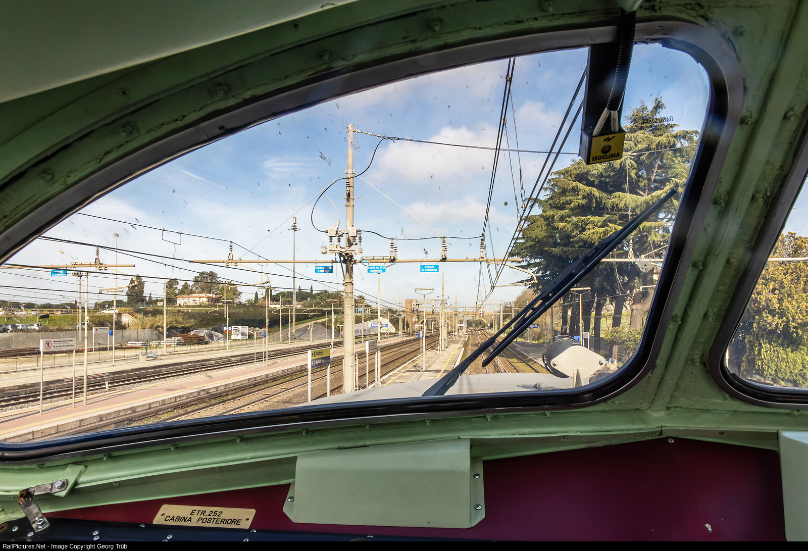 | Driver's view from the small, elevated cab of the ETR # 252 "Arlecchino" of the Fondazione FS Italiane, on the journey from Roma southwards to Napoli. The view is from the rear cab (not in use) back to the tracks. |