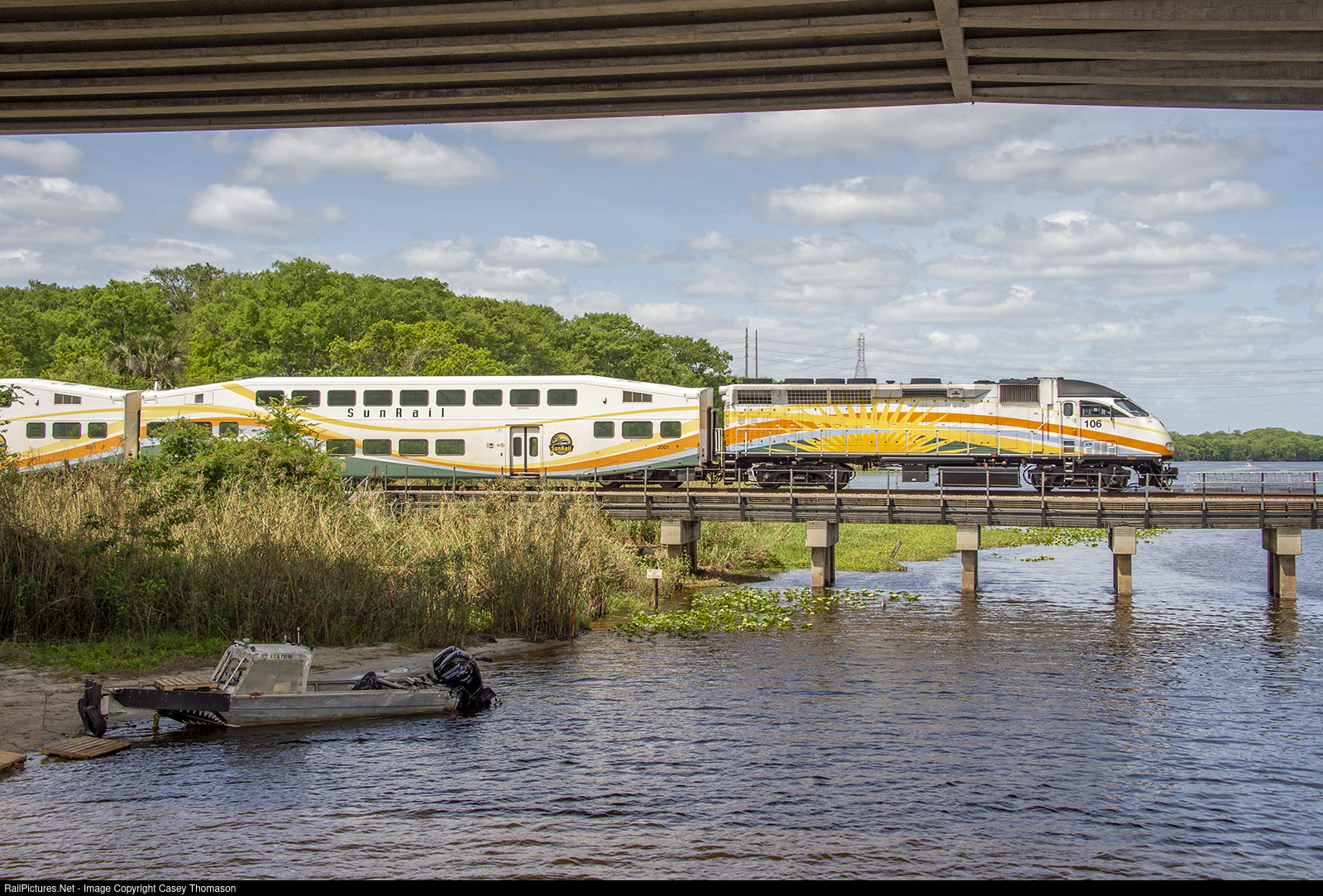 SunRail commuter train P31631 deadheads south across Lake Monroe into Sanford, FL, headed towards the Operations Control Center yard for a mid-day layover.