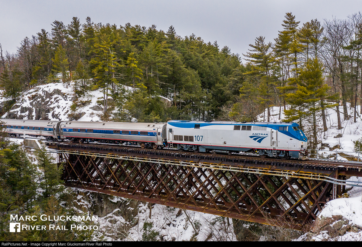 Train To Montreal Today. Amtrak operated its last full Adirondack (Trains 68/69) between New York Penn Station in New York, New York and Central Station in Montreal Quebec in March of 2020 when the service was temporarily discontinued due to pandemic related restrictions. Today, April 3, 2023, the northbound service will be restored (Train 69), with that train returning as the first southbound (Train 68) on April 4, 2023. Long time Delaware & Hudson passenger service on this line ceased with Amtrak's inception in 1971, but was restored in cooperation with the D&H in 1974. Through various route changes over the years, it continued operating until 2020. On February 7, 2021, Amtrak Train 835 operated as a crew requalification train from Albany-Rensselaer, New York to Rouses Point, New York to keep crews current on the US/Canadian Pacific portion of the route. The train was double ended with P42DCs 107 and 103 to facilitate the return trip. The train is seen running above the shores of Lake Champlain in Willsboro, New York, one of the many scenic locations on this route.