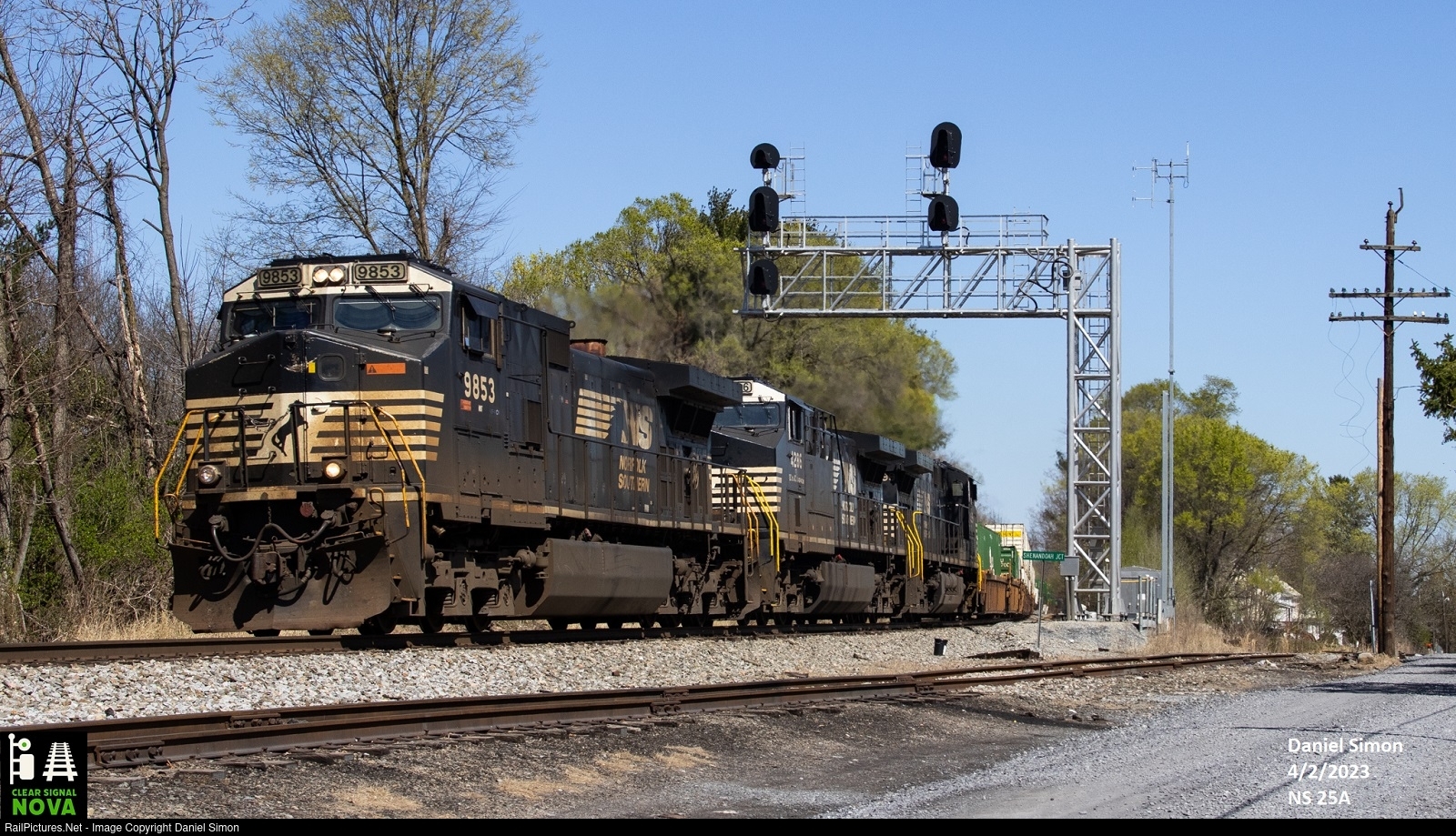 Under a bright blue sky, Norfolk Southern Train 25A rolls under the signal bridge in the popular railfanning hotspot of Shenandoah Junction, West Virginia,