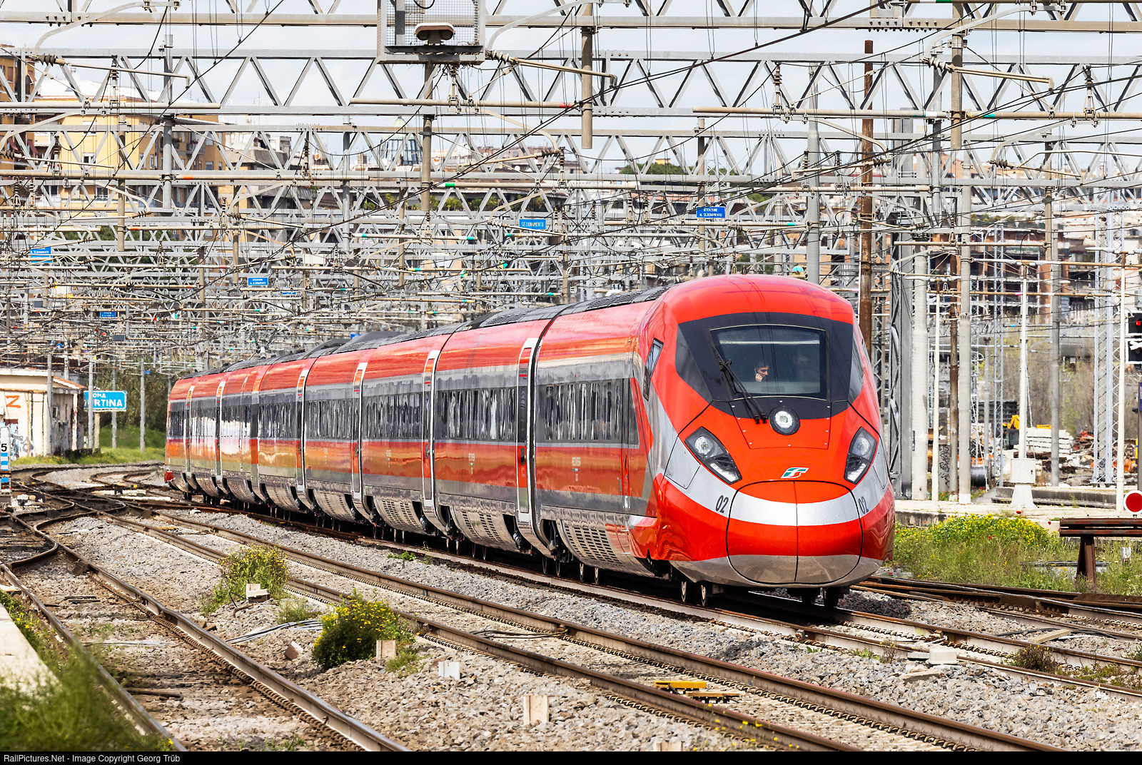 Highspeed train "Frecciarossa 1000" of Trenitalia, ETR 400 # 02, is running through Roma Tiburtina with about 100 km/h, as FR 9619 from Milano Centrale via Roma Termini to Napoli Centrale. Trenitalia has 64 of this "V300 Zefiro" trains for 300 km/h, built by Bombardier/AnsaloBreda, new Hitachi Rail.