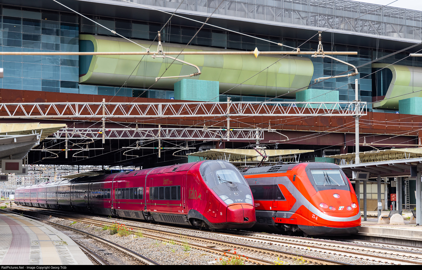 | ETR 575 # 016 of the NTV (Nuovo Trasporto Viaggiatori or italotren) is overtaking the ETR 500 # 025 of the competitor Trenitalia, which stopped in Roma Tiburtina, running as FR 9423 from Fiumincino (Airport) via Roma Termini-Firenze-Bologna to Venezia Santa Lucia. |