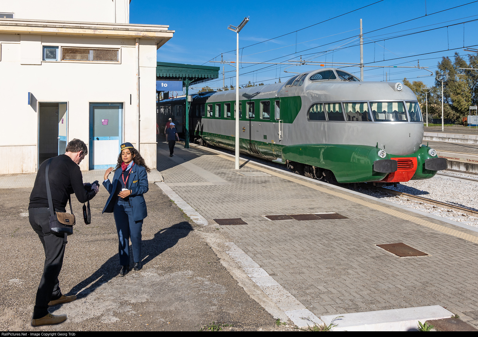 | The iconic express railcar ETR 252 "Arlecchino" stopped in Metaponto on the first day of the journey "BELLA ITALIA EXPRESS" organized by the german IGE Erlebnisreisen from Hersbruck/Germany. The trip this day was from Roma Termini via Napoli-Salerno-Battipaglia-Potenza-Taranto to Bari Centrale. Photographer H.B. takes a picture of the friendly train manager, dressed in a contemporary uniform of the 1960'. |