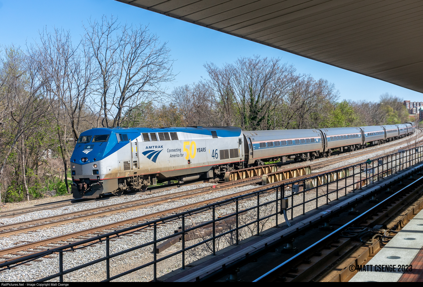 Amtrak P42DC locomotive no. 46 (GE Genesis, 1996-2001) is seen leading train 79 - the southbound Carolinian - past King St-Old Town Station on the WMATA Blue Line. The locomotive is sporting a celebratory paint scheme from the railroad's 50th Anniversary in 2021. |