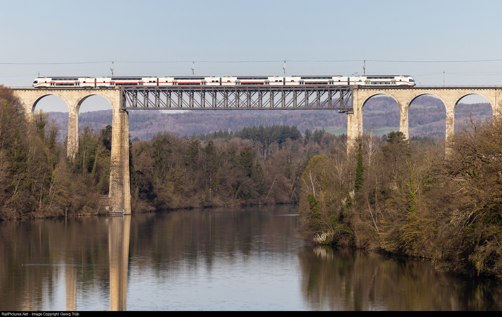 | IC2K (Intercity doubledeck train Kiss) 4010 # 007 of the Deutsche Bahn AG is crossing the Rhine on the 50 meter high and 457 meter long bridge between Eglisau and Hüntwangen-Wil, running as IC 282 from Zürich via Schaffhausen-Singen (Hohentwiel)-Tuttlingen-Horb to Stuttgart. |
