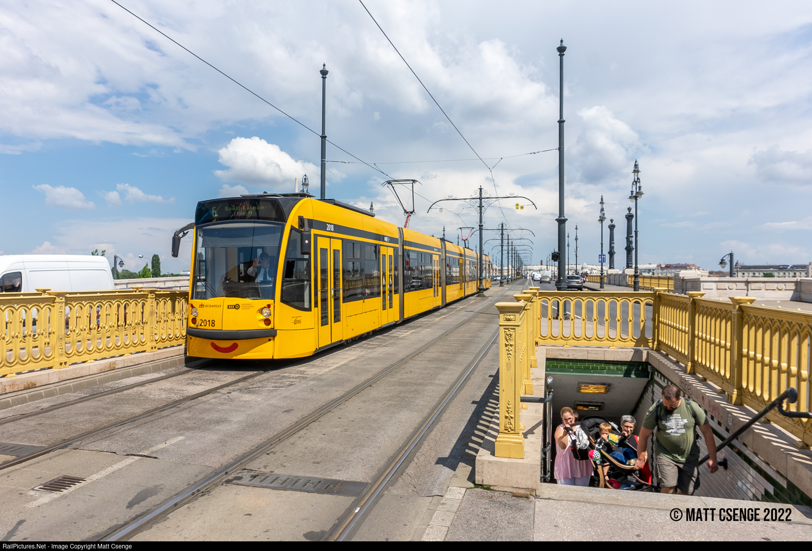 A Budapesti Közlekedési Vállalat (BKV, Budapest Transit Company) Combino Supra tram (Siemens, 2006-2007) on Line 6 is seen arriving at Margit híd, budai hídf? station. The station for Lines 4 and 6 is on Margit híd itself, and the stairs from the platform allow connections to the Line 17, 19, and 41 station on ground level as well as the underground MÁV-HÉV Line H5 commuter rail station.