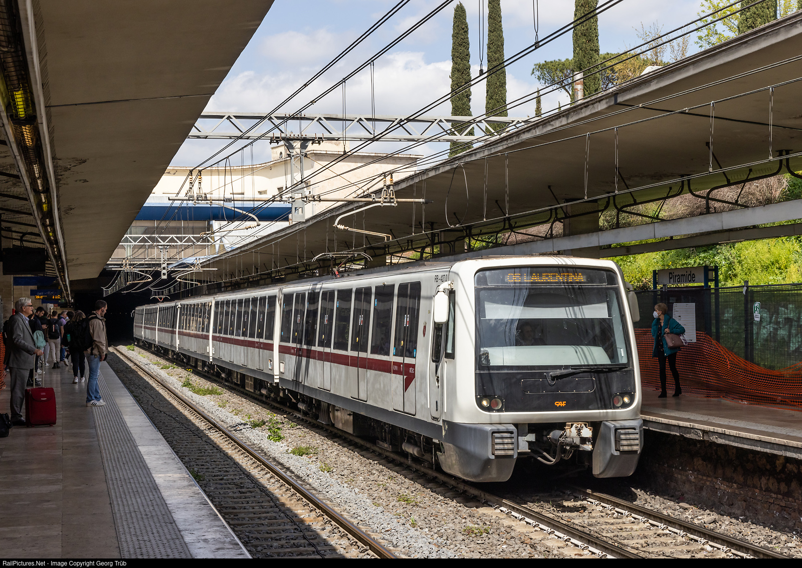 Train of line B of the subway of Rome, built by CAF of type MB400, in Piramide station on the way to Laurentina. The number of the first vehicle is RB 427.0.