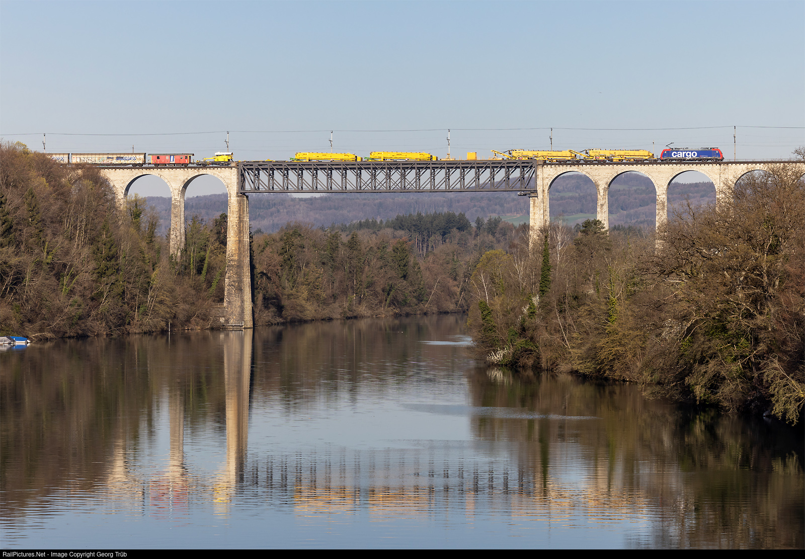 Bombardier TRAXX F140 MS Re 484 # 008 of the SBB is pulling the freight train 44612 from the Limmattal shunting yard (RBL) via Zürich Altstetten-Bülach-Schaffhausen to Singen (Hohentwiel)/Germany, over the 50 meter high and 457 meter long Rhine viaduct between Eglisau and Hüntwangen-Wil. In the train are several track maintenance vehicles, which are going to Schaffhausen only.